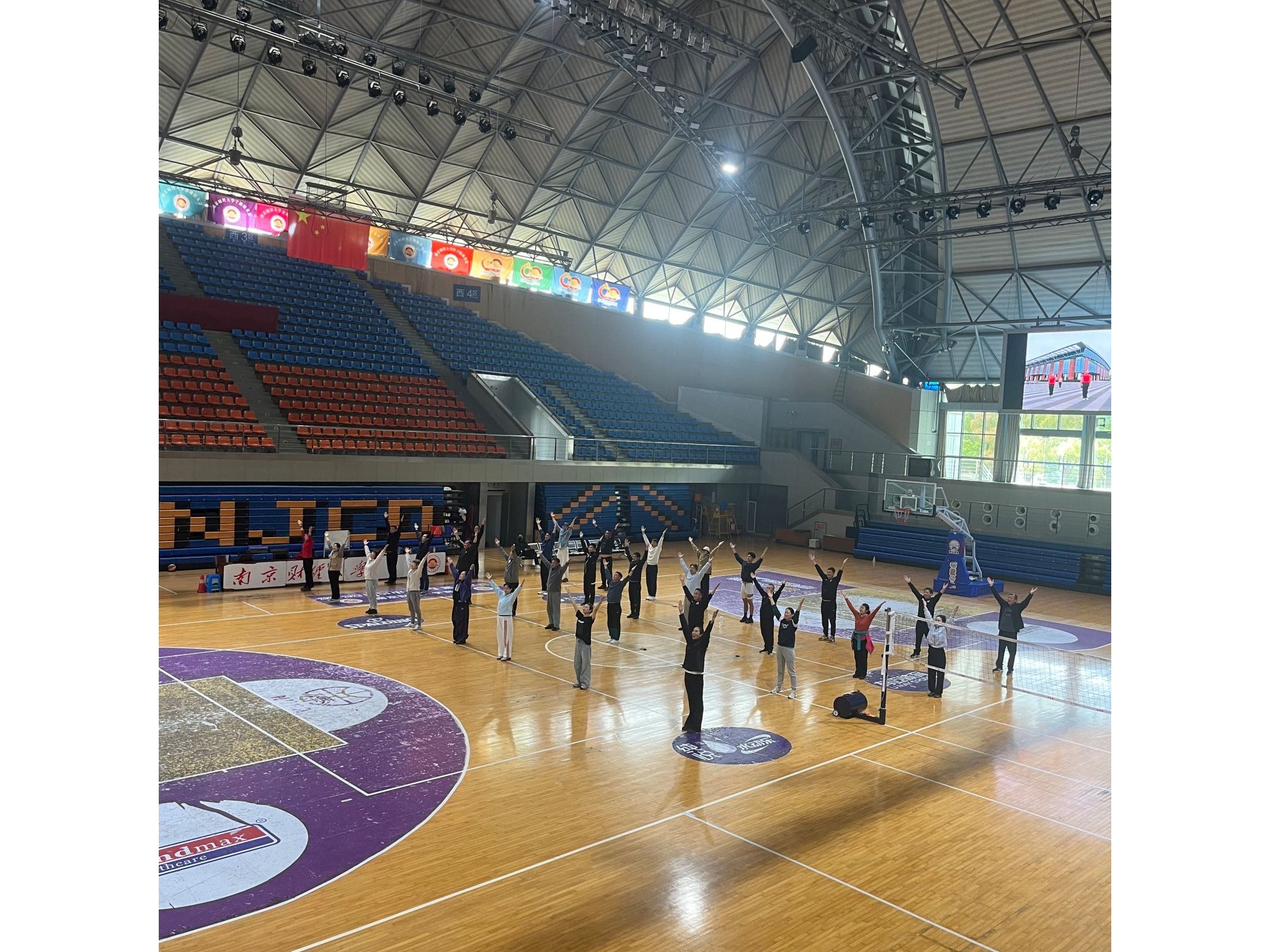 活动现场,体育部充分利用体育馆主馆的大屏幕,实时投放第九套广播体操的标准教学视频。教师们跟随视频示范,逐节分解动作,从预备节到整理运动,认真揣摩每一拍的节奏与规范要领。大家互相纠正、反复练习,现场学习氛围浓厚。